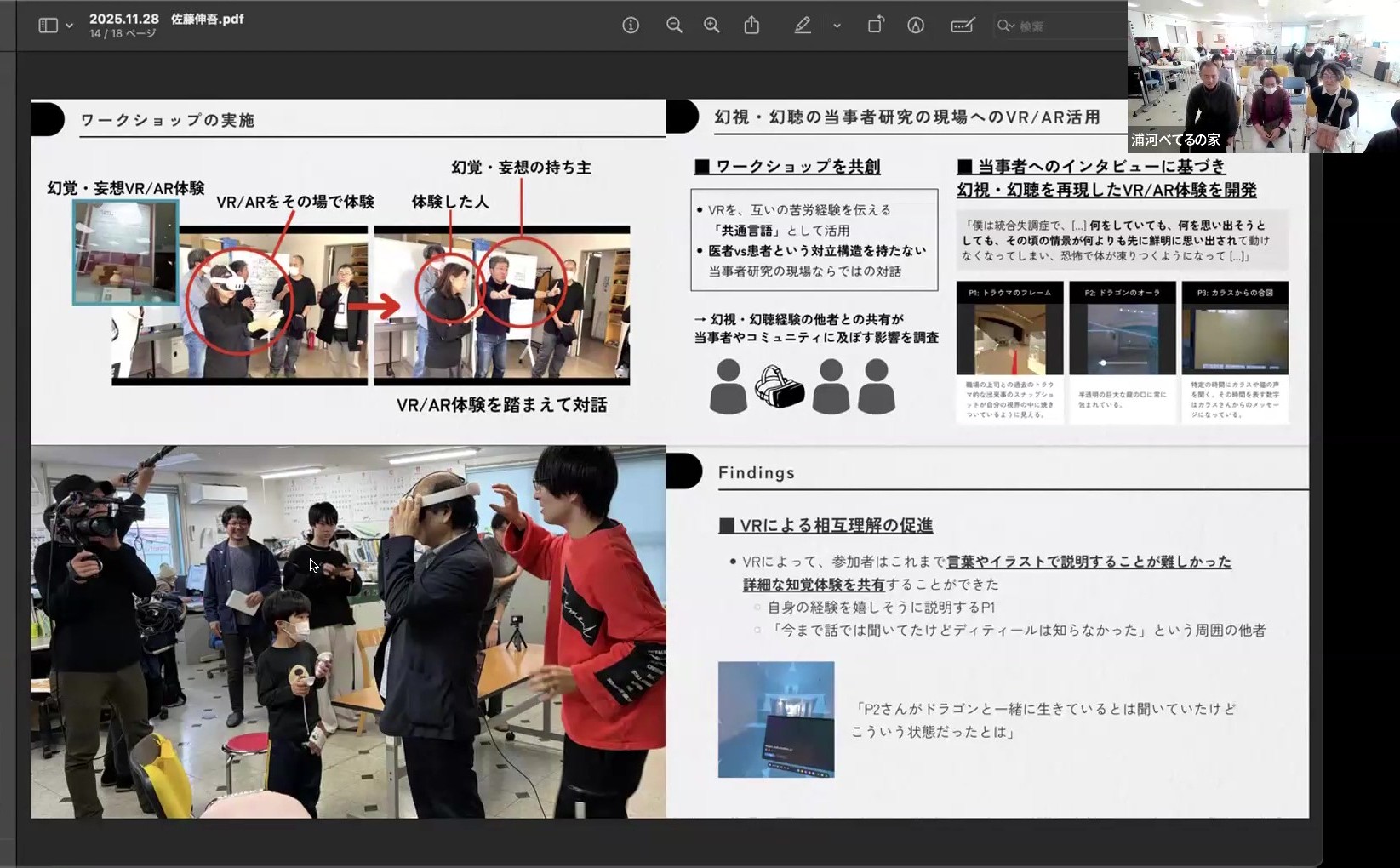 Sさんは幻覚の体験について発表してくださいました。東大とコラボレーションしてSさんが体験した幻覚をVRで再現したそうです!ぜひ体験してみたいですね!